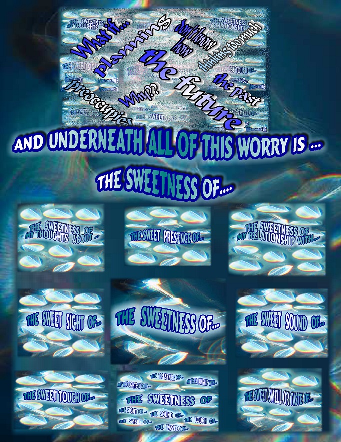 next created a clear transparency overlay that could be flipped down, on top of each “Sweetness” page… the overlay was murky… it showed how “preoccupation” was making it difficult for me to see any beauty or wonder…That “Sweetness of ….” page is slightly visible underneath…but obscured by the worries…