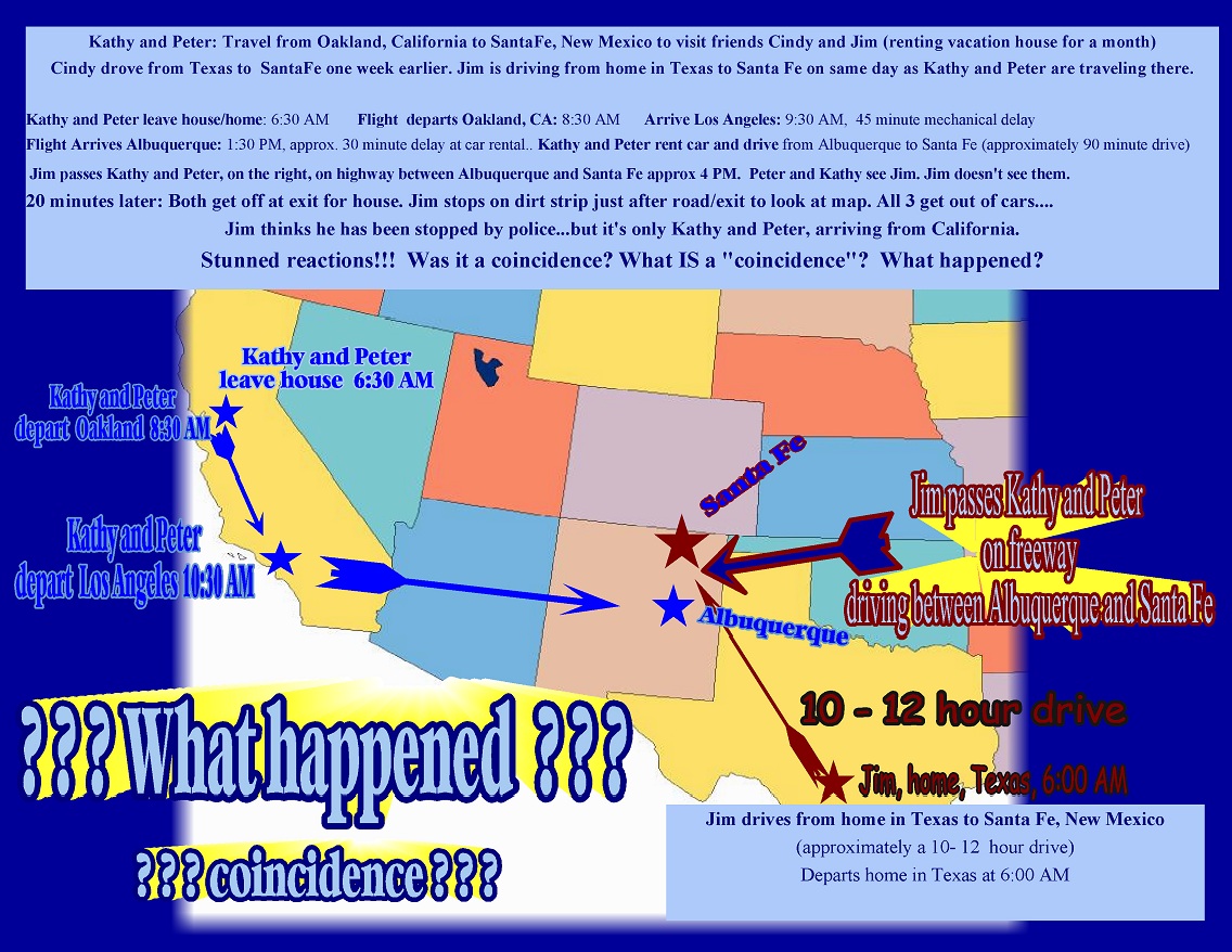 The “coincidence” described on the above map seemed really bizarre to us….how in the world could something like that happen???? Kathy and Peter’s airplane flight from Oakland to LA to Albuquerque was moderately long, with multiple delays. Then there was a delay at the rental car office. Jim’s trip from Texas to Santa Fe was anticipated to be a 10 to 12 hour drive.