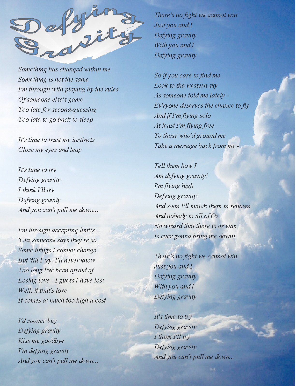 From the Broadway musical Wicked…Defying Gravity…