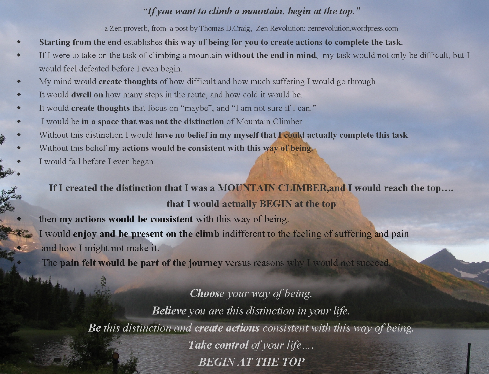 I saw this quote, “If you want to climb a mountain, begin at the top” in a post titled  “Begin at the Top,”  on Thomas Craig’s blog Zen Revolution…I highly recommend linking to that post and reading those ideas…. here are a few of the ideas that I directly quote, but presented as a bulleted list,  in different format… and put onto a “page”…to help myself think and reflect more clearly….