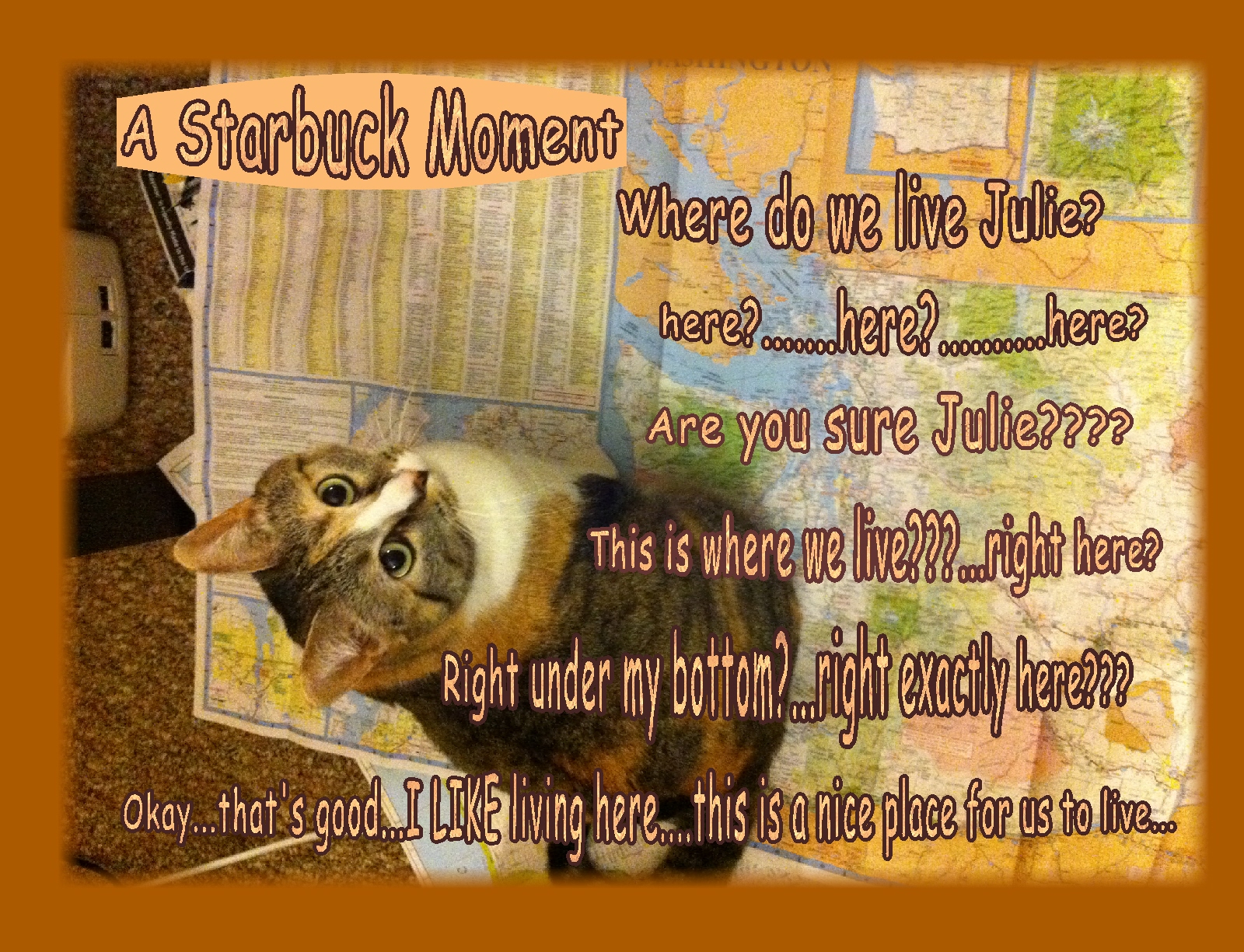 Starbuck, with the gold collar-fur, arrived in Julie’s life, 2 years ago, on November 2, 2010… an abandoned, sick, hungry, timid, flea ridden kitty…meowing outside Julie’s window on a cold Washington evening….and was enticed inside, settling happily into Julie’s little “home sweet home”