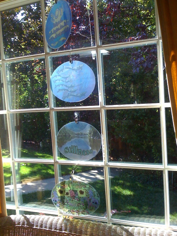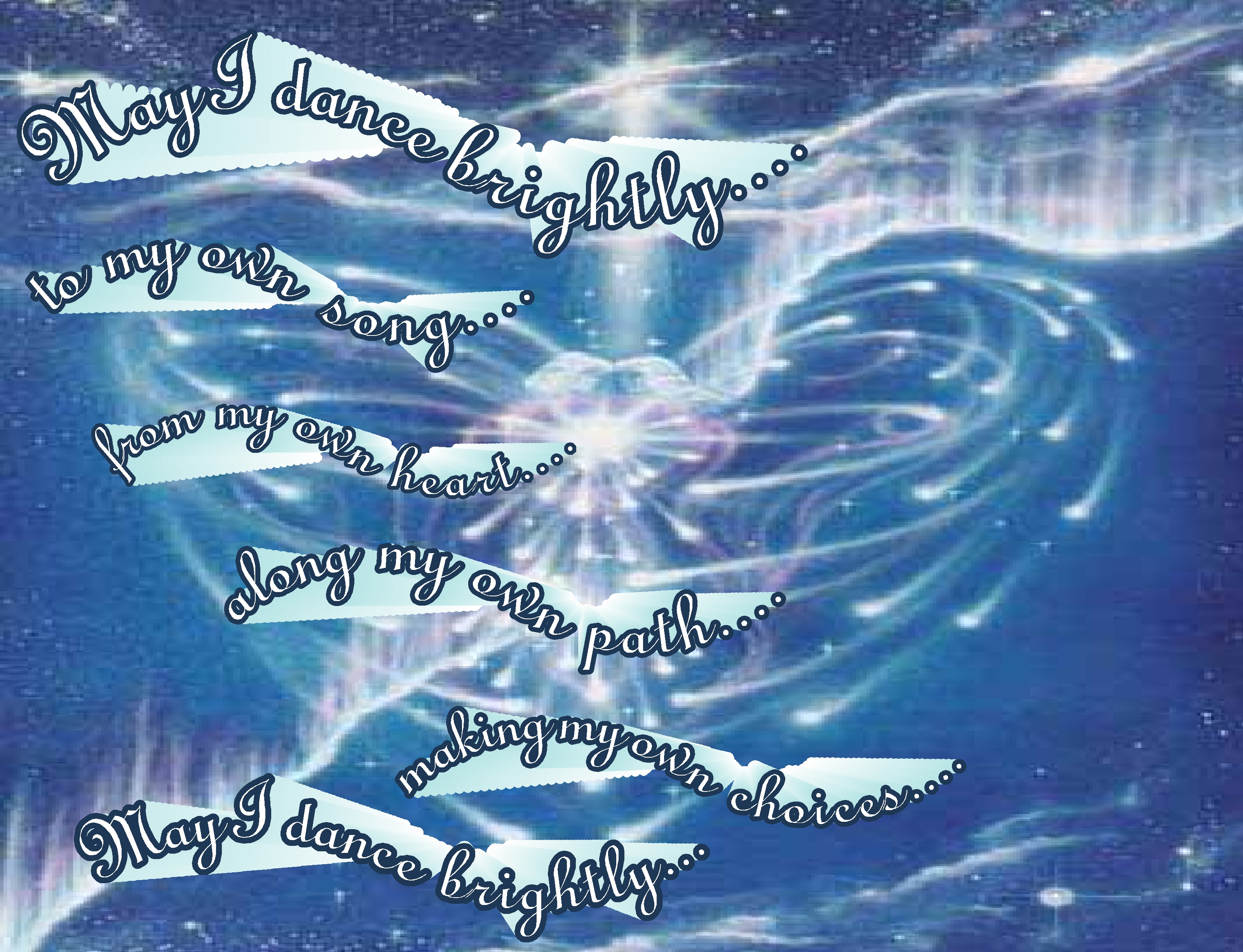 “Dancing Brightly “is one of my favorite pages and “inspirations”…I keep it on cards in my pockets and printed on clear film, hanging in windows, and on the shower door, a continuing reminder to lighten up and dance brightly. I also have one suncatcher layered with the “Stillness” suncatcher… for inspiration to somehow learn to combine or balance “dancing” with “calmness and steadiness”….not sure how to do that, but an ongoing aspiration. Do you suppose such a combination is possible?