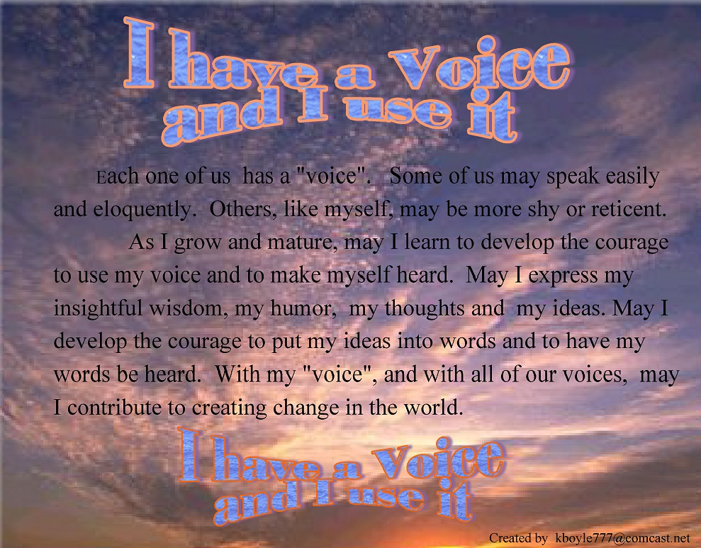 11/2011  I revised the first   “I have a voice” slide show….here’s a link to a post about that process of learning to use one’s voice…“The courage to have a voice and to use it”….so it applies more to learning to use that voice…to have the courage and try and practice….something I’ve been doing….